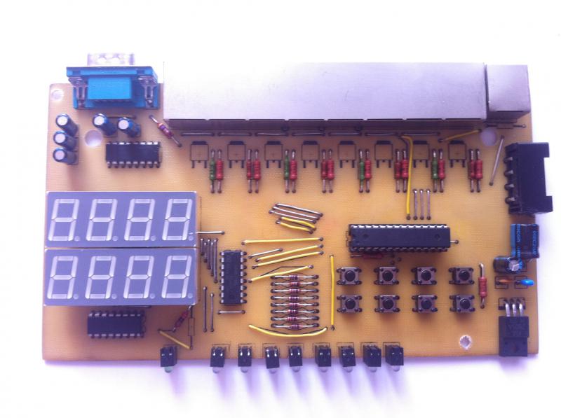 ATmega8, max232, модем Siemens внешний. Установка температуры раздельно на 8 каналов. по входящему звонку отправляется SMS с установленной и фактической температурой по каждому каналу.
